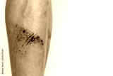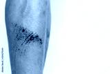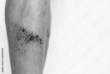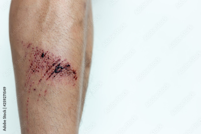 The wound form scabs. The wound happen during young man playing footbal and fall down on the footbal field. He get injured at his shin. It is big wound and abrasions. copy space