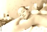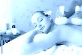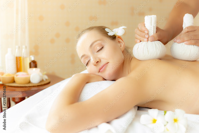 Charming beautiful woman lie prone on bed with naked at spa salon. Masseuse or Massage therapist using herbal balls for help relieve stress and aids relaxation, enhances capacity for calm thinking