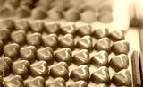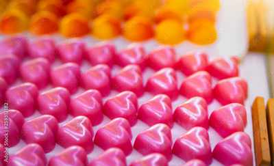 Pink heart shape chocolate. Valentine's day gift. White chocolate ganache with rose scent on white plate. Chocolate pralines. Luxury chocolate candy. Delicious dessert. Food for love and dating.