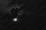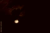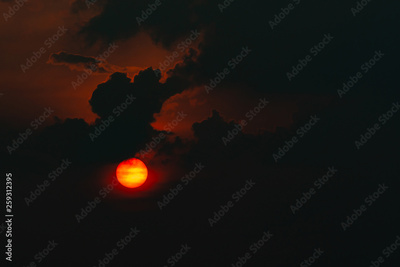 Red big sun in dark clouds. Devil sunset. Horror view of sun in black clouds sky. Summer sunset. Fiery sun in the evening. Nature background. Dramatic sky with big sun. Heat weather. Heaven concept.