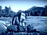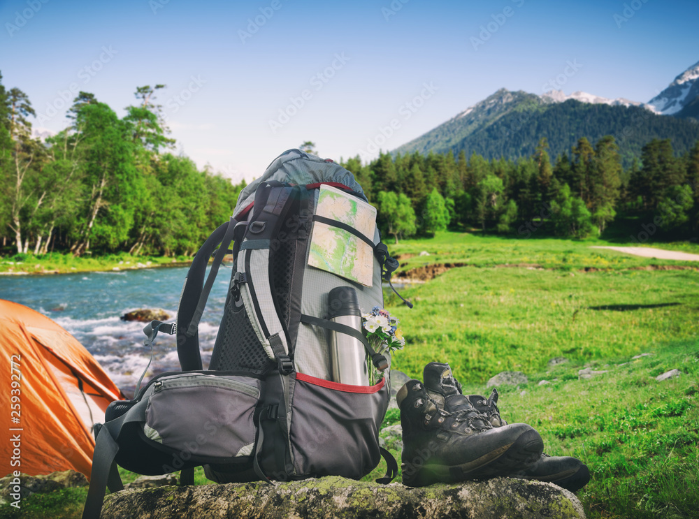 Hiking equipment and camping tent in mountains