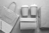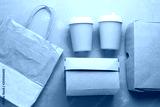 op view flat lay recyclable types of paper packaging on a blue background, paper bag, disposable glass, cardboard box