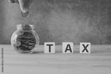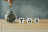 saving tax concept, tax latter on wooden with hand put coin in jar, full money on wooden table