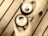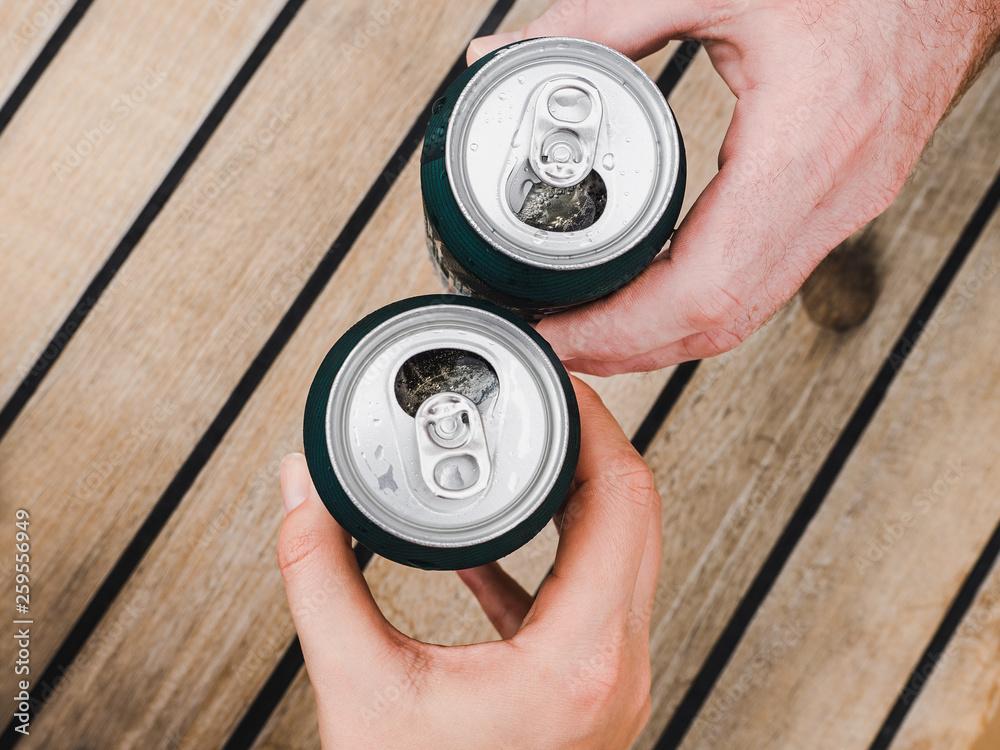Two can of beer, female and male hands on the background of a beautiful, wooden surface. Top view, close-up. Concept of leisure and travel