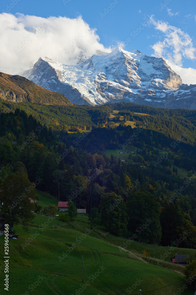 High mountains peaks in clouds above Swiss Alpine village Wengen at sunset.