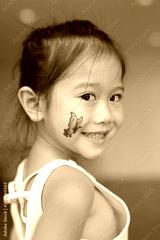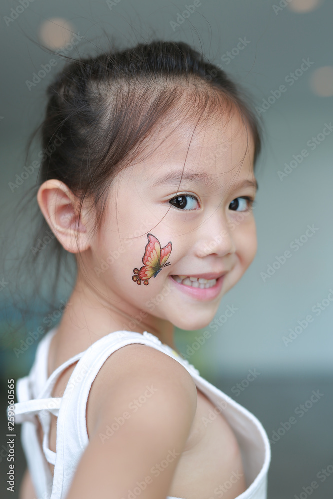 Attractive little kid girl with butterfly tattoo sticker on cheek, Dress up tattoos.
