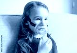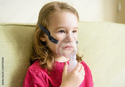 Little girl holds inhaler mask at home. Sick kid breathes through a nebulizer. Baby using equipment to treat asthma or bronchitis. Concept of treatment of children's respiratory and lung diseases.