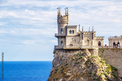 Castle of Swallow's Nest on a cliff, Crimea, Russia. It is a famous tourist attraction of Crimea. View of the Crimea landmark close-up in summer. Architecture and nature of Southern coast of Crimea.