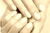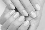 Closeup top view of elegant pastel pink natural manicure. Female hands isolated on white background. Horizontal color photography.