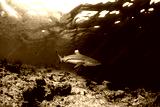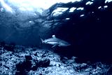 Blacktip reef shark (Carcharhinus melanopterus) swims along the reef edge in the tropical sea