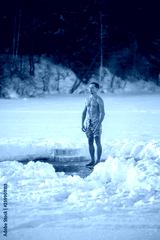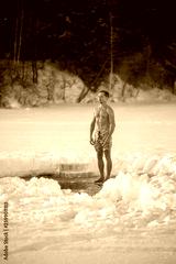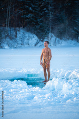 Young man stands barefoot on the ice near the ice hole after swimming in the cold water