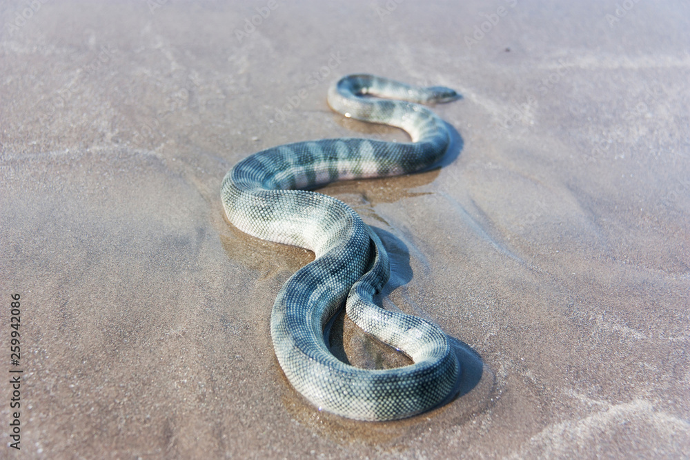 Beaked sea snake (Enhydrina schistosa) on the sand.