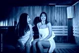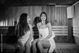 close up photo of two beautiful women wearing white towels in a wooden sauna