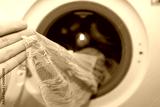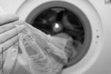 Female hand holding a pink lace dress just washed in an automatic washing machine, delicate wash mode
