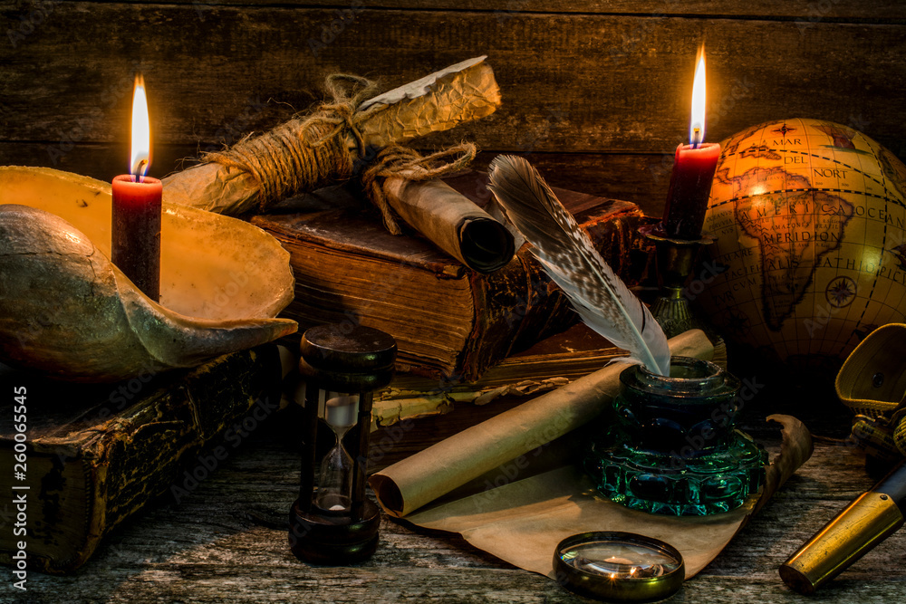 Composition on a theme marine adventures and trips. Objects under old times on a wooden background.