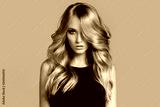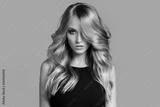 Beautiful woman with long wavy coloring hair. Flat gray background.