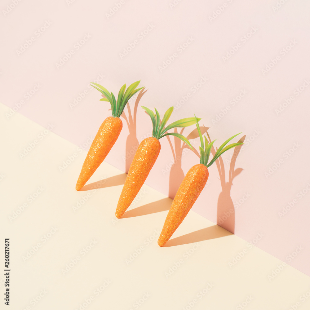 Carrots on pastel yellow. Minimal Easter concept. Spring minimal composition.