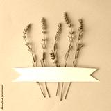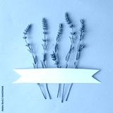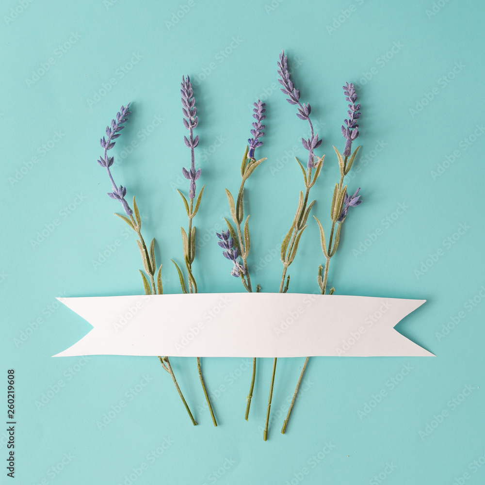 Spring composition made with lavander flowers on bright blue background with ribbon copy space. Creative minimal holiday concept. Flat lay.