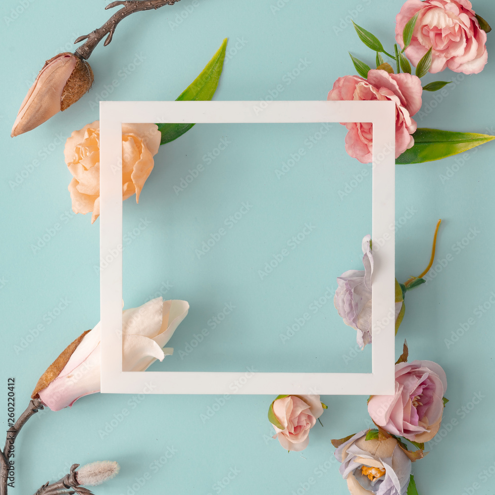 Easter composition made with flowers and eggs on bright blue background with ribbon copy space. Creative minimal holiday concept. Flat lay.
