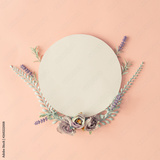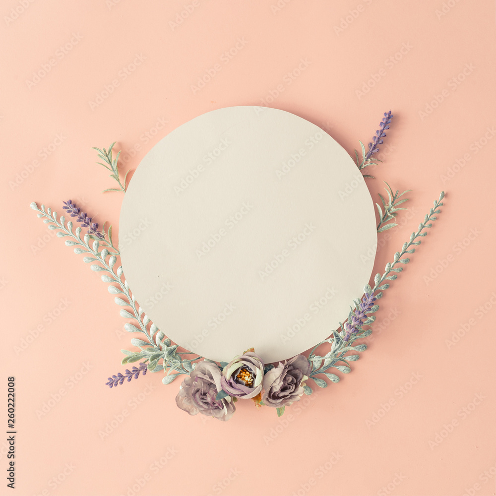 Creative layout made with spring flowers and leaves on pastel pink background. Minimal nature composition with paper card copy space.