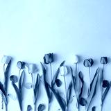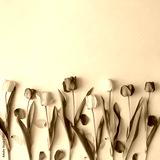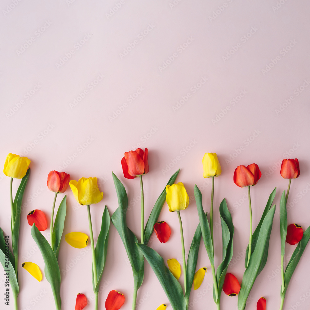 Creative layout made with red and yellow tulip flowers and leaves on pastel pink background. Minimal spring nature composition.