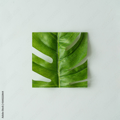Creative layout made with cut out monstera leaf on pastel gray background. Minimal tropical nature composition with copy space.