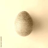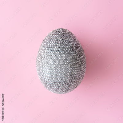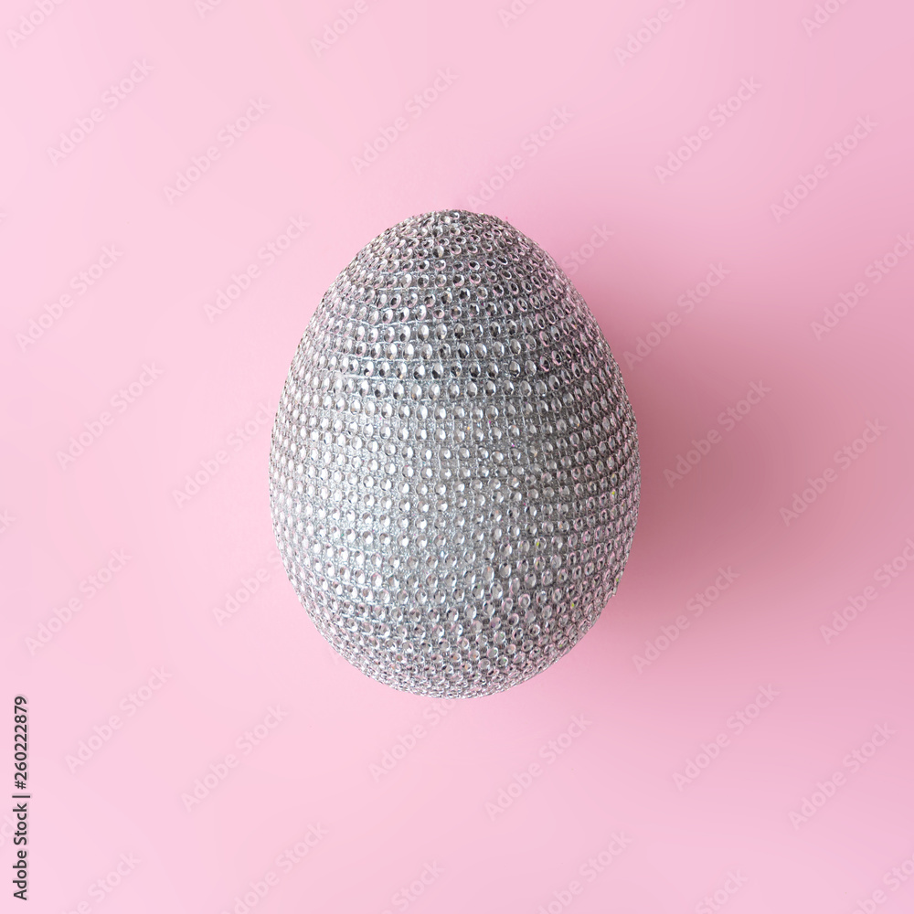 Disco ball Easter egg on pastel pink background. Minimal Easter party concept.
