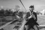Smiling bearded Caucasian successful businessman in formal wear listening music and using smart phone while sitting on rooftop.