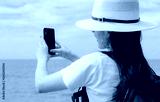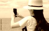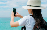 Young Asian backpacker woman wear hat use smartphone taking selfie at pier. Summer vacation at tropical paradise beach. Happy hipster girl travel on holiday. Woman enjoy and relax life. Summer vibes.