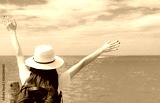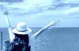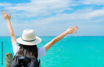 Happy young Asian woman in casual style fashion with straw hat and backpack. Relax and enjoy holiday at tropical paradise beach. Girl stand at the wood pier of resort in summer vacation. Summer vibes.