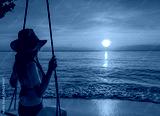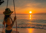 Sexy woman wear bikini and straw hat swing the swings at tropical beach on summer vacation at sunset. Girl in swimwear sit on swings and watching beautiful sunset. Summer vibes. Woman travel alone.