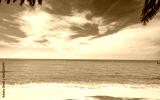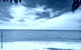 Golden sand beach by the sea with emerald green sea water and blue sky and white clouds. Summer vacation on tropical paradise beach concept. Ripple of water splash on sandy beach. Summer vibes.