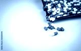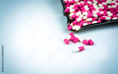 Pink and white antibiotic capsule pills and drug tray on white background. Global healthcare concept. Antibiotics drug resistance concept. Antimicrobial capsule pills. Antibiotic drug use in hospital.