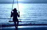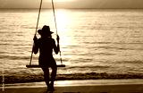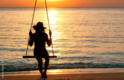 Silhouette woman wear bikini and straw hat swing the swings at the beach on summer vacation at sunset. Enjoying and relaxing girl on holiday. Summer vibes. Woman watching beautiful sunset sky.