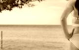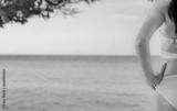 Back view of sexy adult Asian woman wear pink bikini relaxing and enjoy holiday at tropical paradise beach. Girl in summer vacation fashion. Summer vibes. Summer time. Woman enjoy swimming in the sea.