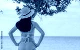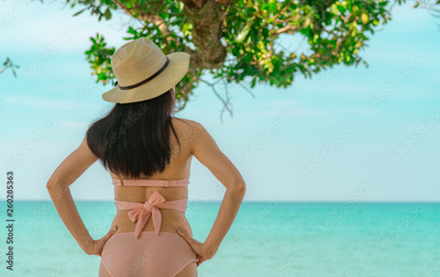 Back view of happy young Asian woman in pink swimsuit and straw hat relaxing and enjoy holiday at tropical paradise beach on vacation. Girl in summer vacation fashion. Beauty sexy model. Summer vibes.