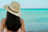 Back view of happy young Asian woman in pink swimsuit and straw hat relax and enjoy holiday at tropical paradise beach at sunset. Girl in summer vacation fashion. Beauty sexy model. Summer vibes.