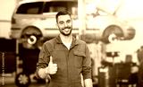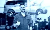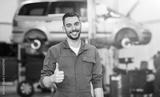 car service, repair, maintenance, gesture and people concept - happy smiling auto mechanic man or smith showing thumbs up at workshop