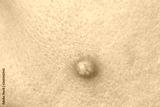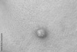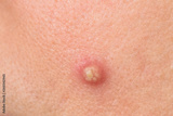 Closeup view of big ugly pimple on skin of face of woman. Horizontal color photography,