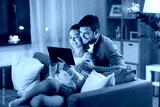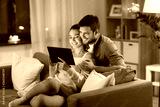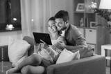 technology, internet and people concept - happy couple using tablet computer at home in evening