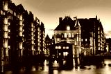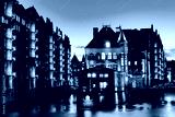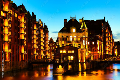 The Warehouse district Speicherstadt during twilight sunset in Hamburg, Germany. Illuminated warehouses in Hafencity quarter in Hamburg.