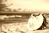 Straw hat and blue bikini bra swimsuit with beach bag against the ocean beach with beautiful blue sky and clouds. Relaxation, vacation idyllic background.