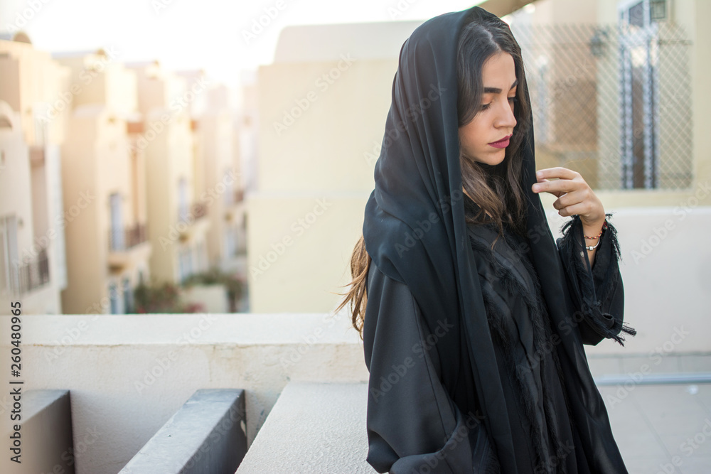 Beautiful middle eastern young woman wearing tradition arabic clothes standing and looking down outdoors