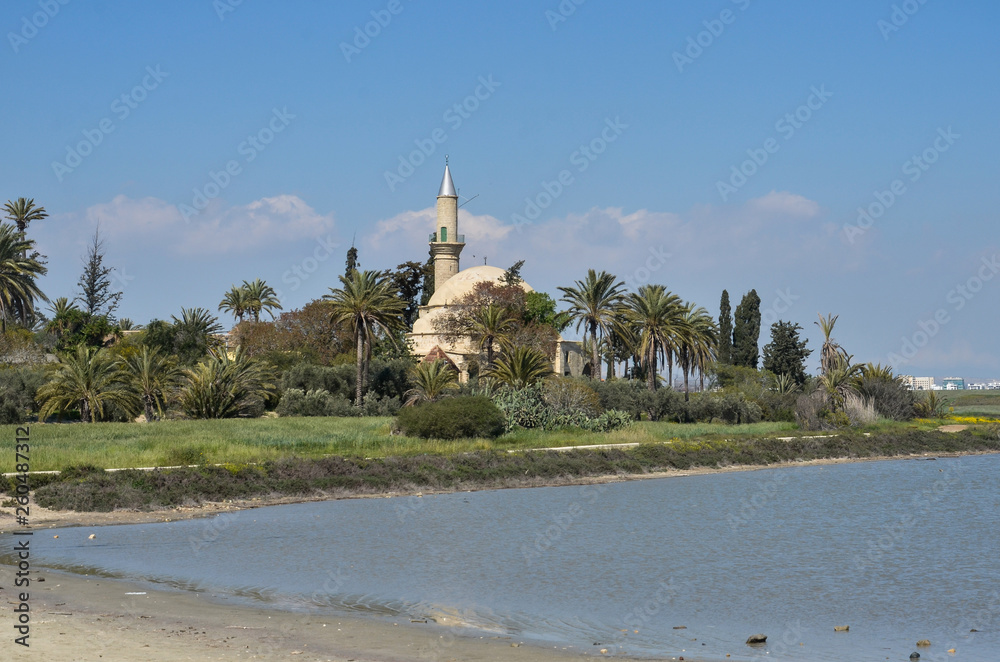 Hala Sultan Tekke or the Mosque of Umm Haram, a Muslim shrine on the west bank of Larnaca Salt Lake, near Larnaca, Cyprus. Umm Haram was a companion of the Prophet Muhammed