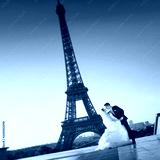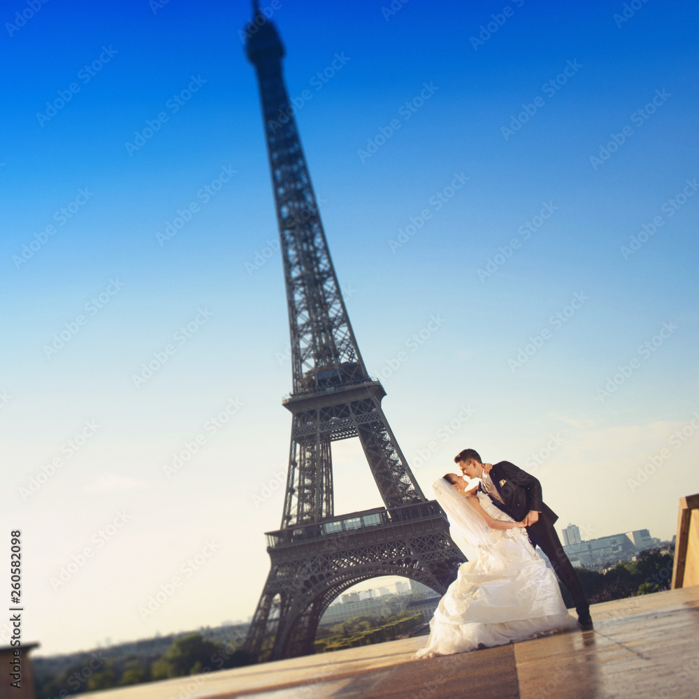 Beautiful wedding couple has fun posing on the square before the Eiffel Tower in Paris