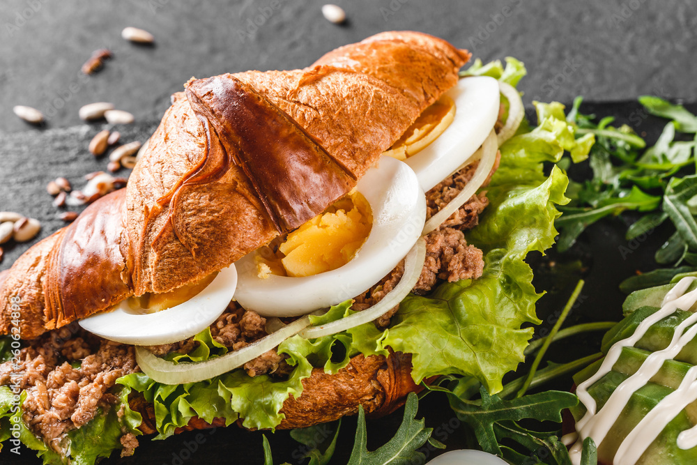 Croissant sandwich with tuna, eggs, avocado, fresh arugula and greens on black shale board over black stone background. Healthy food concept