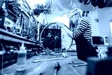 Cute Caucasian female worker holding and repairing bicycle wheel while standing in bicycle workshop.