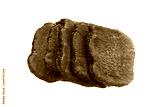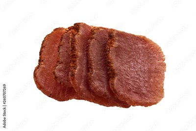 Basturma, dried tenderloin of beef meat, thinly sliced, on a white background.
