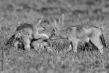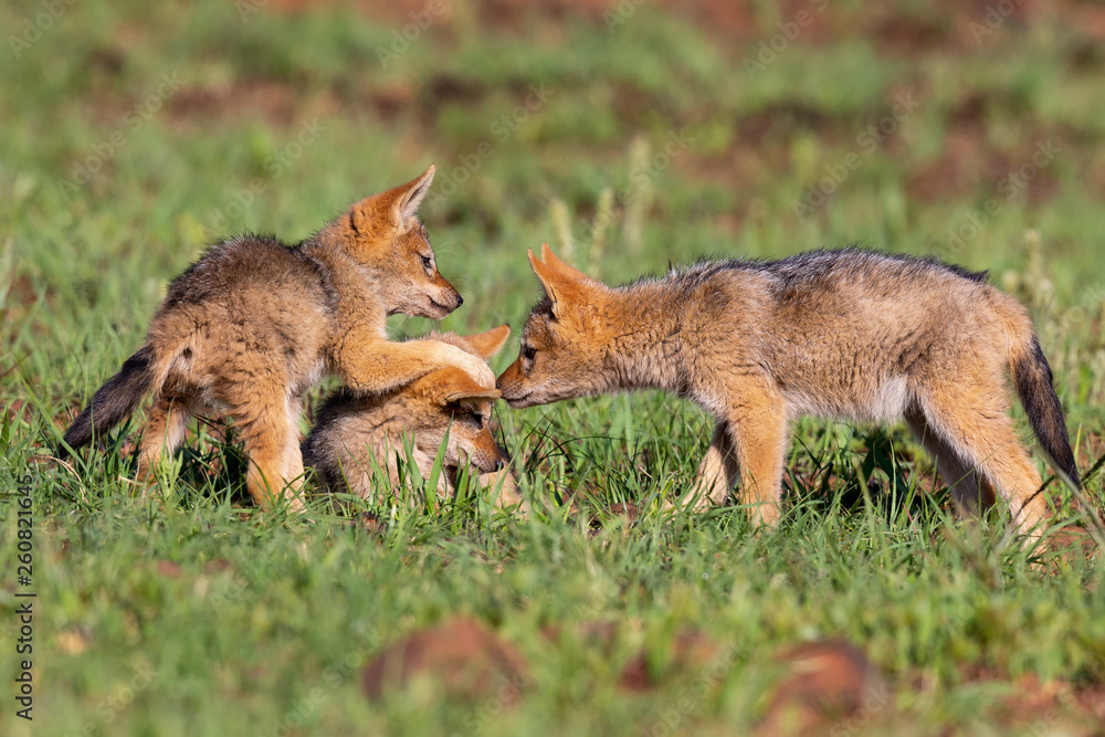 Three Black Backed Jackal puppies play in short green grass to develop skills