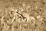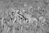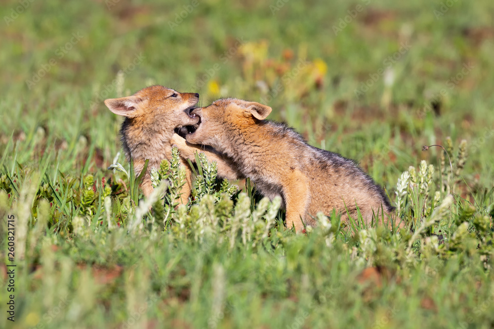 Two Black Backed Jackal puppies play in short green grass to develop skills